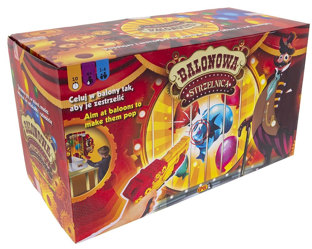 z lekarzem. Nie używać pocisków innych, niż dołączone do zestawu. Nie kierować pistoletu w stronę ludzi i zwierząt. Nie przykładać do oczu i twarzy. Podczas zabawy dzieci poniżej 8. roku życia – wymagany nadzór osoby dorosłej – ryzyko uduszenia pękniętymi lub nienadmuchanymi balonami. Trzymać nienadmuchane balony w miejscu niedostępnych dla dzieci. Nie owijać wokół szyi. Natychmiast wyrzucić pęknięte balony. Balony wykonano z naturalnego lateksu. Nie modyfikować ani nie wymieniać części w zabawce. Przed podaniem zabawki dziecku należy usunąć opakowanie i wszystkie plastikowe zaczepy. Kolory i kształty mogą się nieznacznie różnić od pokazanych na opakowaniu. Wyprodukowano w Chinach.