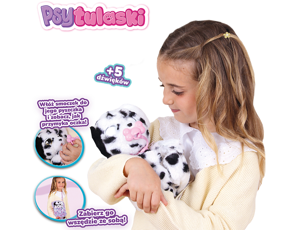 Te interaktywne pieski potrafią zamykać oczy i reagować na dotyk oraz ruch, co dodaje im realizmu i sprawia, że dzieci czują się, jakby opiekowały się żywymi szczeniakami. Dzięki mobilnej aplikacji, Psytulaski oferują pełną zabawę, umożliwiając sprawdzanie stanu zdrowia piesków oraz opiekę nad nimi poprzez codzienne zadania i minigry.